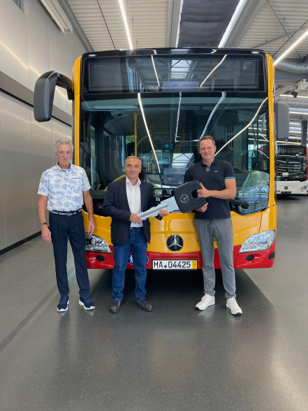 von rechts - Geschäftsführer Marcel Walter und Mercedes Benz Bus Verkäufer Herr Graff sowie Senior Chef Matthias Walter bei der Auslieferung in Mannheim 07/2025